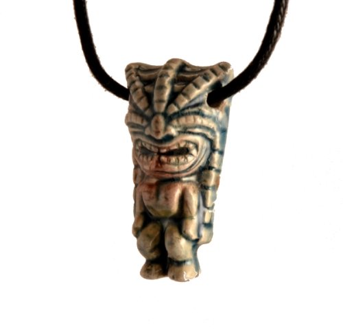 Ceramic Angry Tiki, This is the perfect little addition to your luau wear! at 1.4 inches this ceramic tiki necklace will spice up any tropical event! Includes a 30 inch cord. Due to the nature of the material colors will vary slightly from blue to green to brown, if you have a preference please email us.